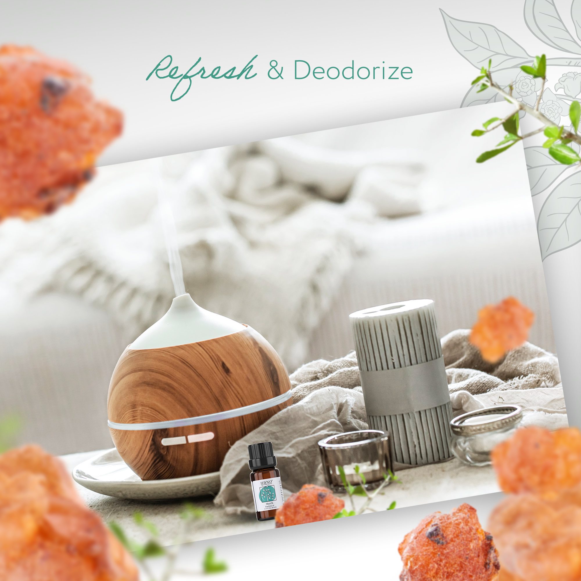 Add 3-5 drops of Myrrh essential oil for every 100 ml of water. It will not only freshen up the atmosphere but also engulf you in its warm, woody, earthy aroma.